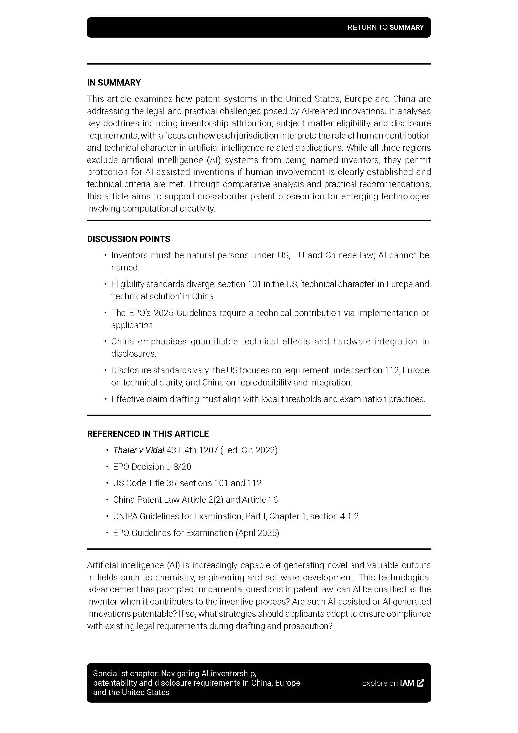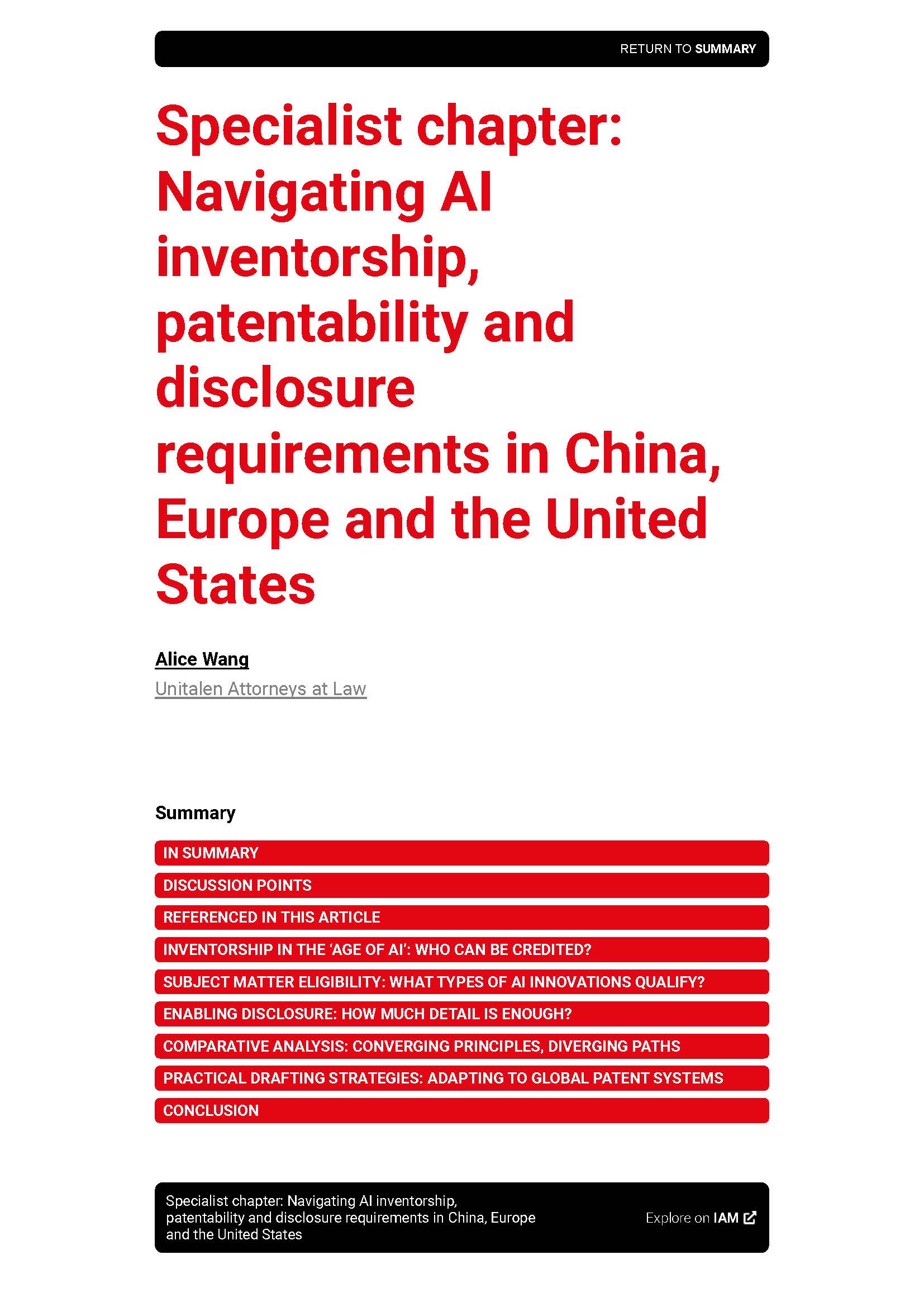 集佳文章《Specialist chapter:Navigating AI inventorship, patentability and disclosure requirements in China, Europe and the United States》在《IAM》发表