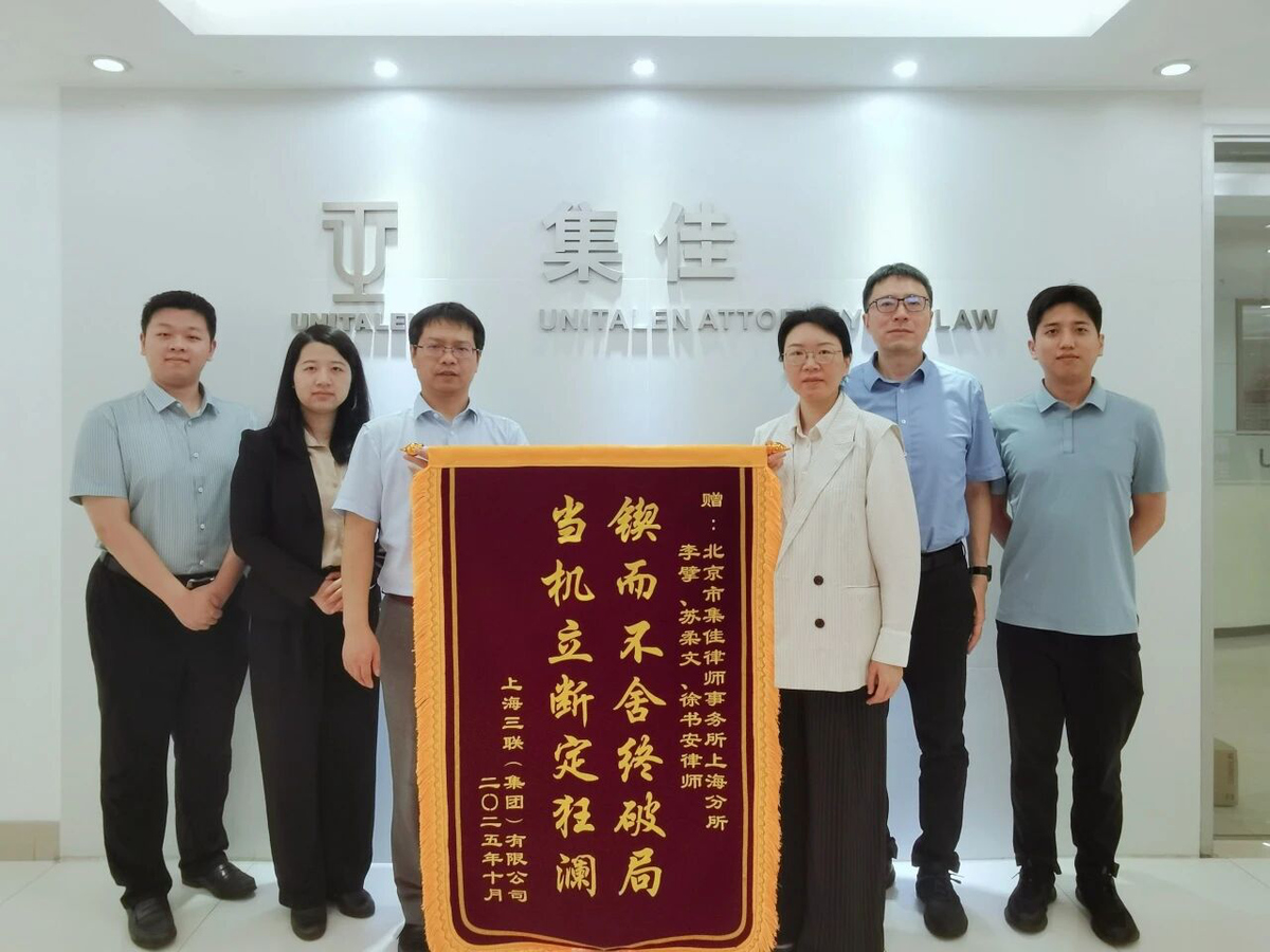 近日,集佳上海分所代理的上海三联(集团)有限公司与上海某公司、大丰某公司等侵害商标权及不正当竞争纠纷案的执行取得重大进展,上海三联集团代表专程莅临集佳上海分所,送来表扬锦旗...2025-10-14