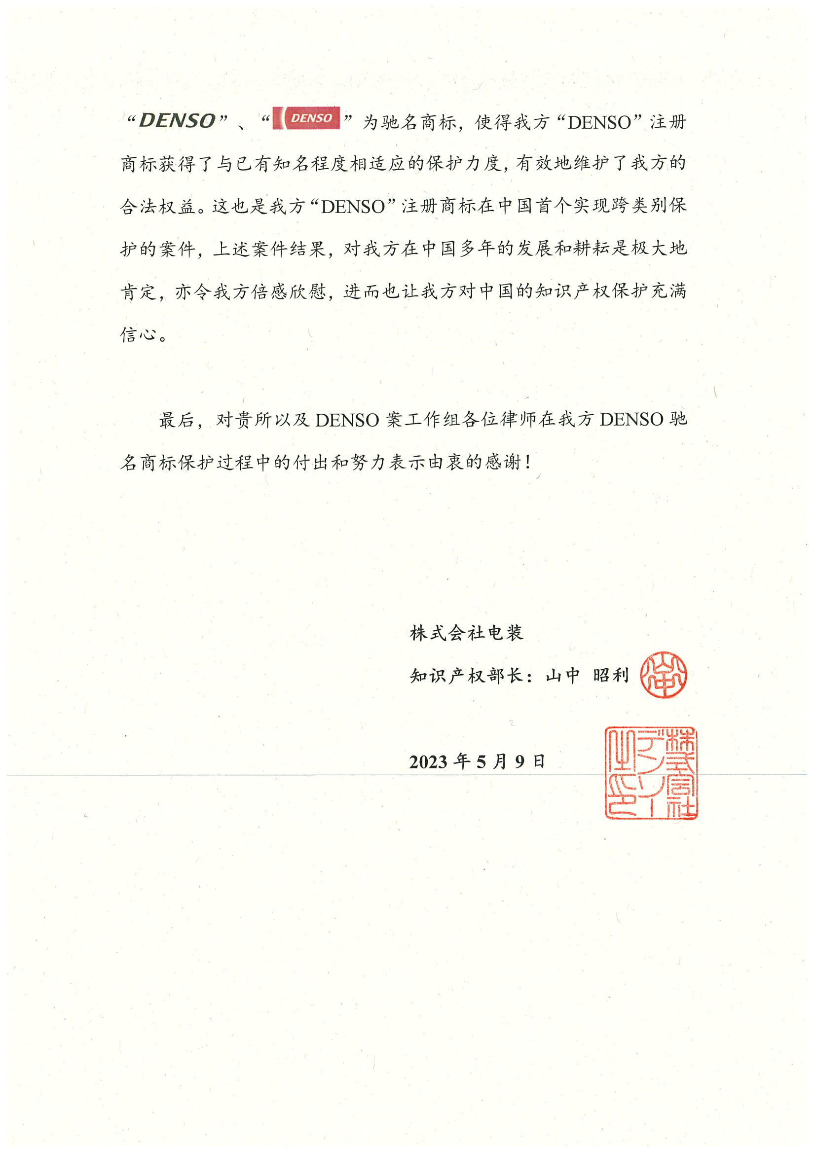 上述案件是“DENSO”注册商标在中国首个实现跨类别保护的案件,通过该案,集佳成功代理客户使其“DENSO”注册商标获得了与已有知名程度相适应的保护力度,有效地维护了客户的合法权益。