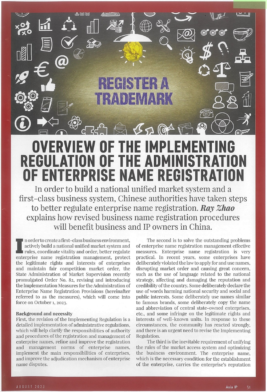 集佳合伙人赵雷律师文章《Overview of the Implementing Regulation of the Administration of Enterprise Name Registration》在《Asia IP》发表