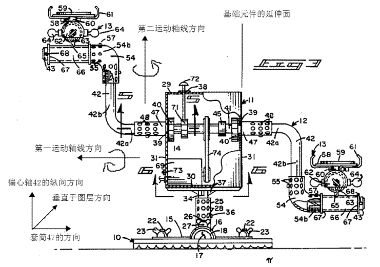 为此,代理人与审查员进行了电话沟通,沟通后更加佐证了代理人的判断。审查员认为偏心轴42的纵向方向对应于案例的权利要求5和6中的“第二运动轴线”。这完全不符合事实。根据对比文件3的图3,显然,如果将管式紧固套筒47认为等同于案例中的第一运动轴线,那么垂直于图层的方向(在附图中的用红圈标明的方向)才等同于案例中的第二运动轴线。然而,可以明确地从对比文件3的图3中看到,沿着偏心轴42的方向(在图层的平面中竖直的方向)完全不同于案例中的“第二运动轴线”。此外,显然偏心轴42根本不可能围绕垂直于图层的方向旋转。对比文件3完全没有公开权利要求5和6中的技术特征。