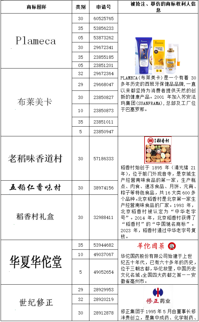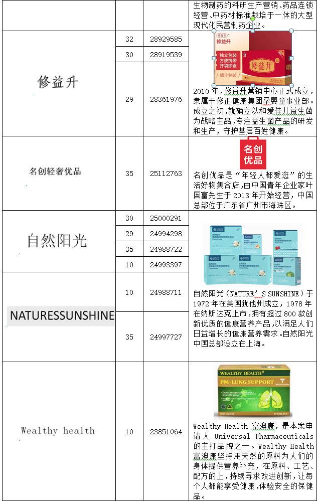 在分析系争商标申请人申请注册商标之时,需要对其申请的商标进行逐一分析、比对,并阐述说明被抢注的商标的真实权利人的情况,并提供参考证据。如第23851064号“WEALTHY HEALTH”商标无效宣告案(系争商标申请人共申请156件商标)中,代理人发现该商标申请人北京鑫鹏福元商贸有限公司申请的多件商标与其他具有强显著性和知名度的商标相同或者近似,且被抢注的商标的真实权利人根据查询均可以一一对应。通过列表,这些系争商标申请人抢注他人的情况可以很清晰的展示出来。